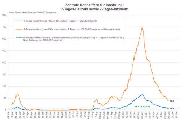 Innsbruck – Die Entwicklung der Covid19-Infektionszahlen bietet in Innsbruck erstmals seit langer Zeit Anlass für positive Nachrichten: Mit Stand Montag, 28. Dezember, 8.30 Uhr, sind 165 aktive positive Fälle gemeldet, pro 100.000 Einwohner beträgt die Zahl der Infektionen 125. Die Sieben-Tages-Inzidenz, sprich die Zahl der neu gemeldeten Fälle in den vergangenen sieben Tage pro 100.000 Einwohner, beträgt 78. Innsbruck ist damit die erste Landeshauptstadt, in der die Sieben-Tages-Inzidenz unter 100 liegt.