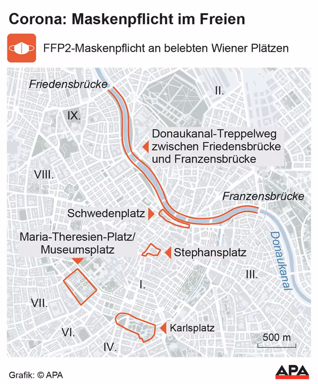 Von der nun dazu gekommenen FFP2-Maskenpflicht sind der Donaukanal, der Schweden- und der Stephansplatz, der Karlsplatz mit dem anschließenden Resselpark sowie der Maria-Theresien-Platz zwischen Kunst- und Naturhistorischem Museum betroffen, gab Bürgermeister Michael Ludwig (SPÖ) bekannt.