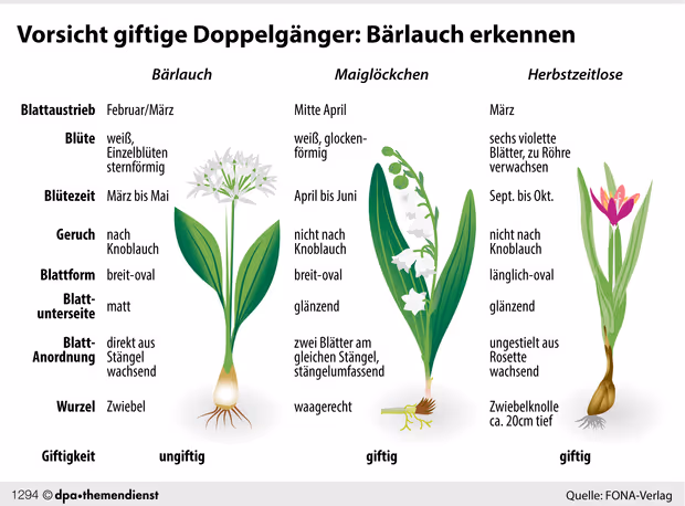 Nach Angaben des rheinland-pfälzischen Dienstleistungszentrums Ländlicher Raum (DLR) lässt sich Bärlauch an langgestielten Blättern erkennen. Er zeichne sich zudem durch einen deutlichen Knoblauchgeruch aus. Die Blätter der Herbstzeitlosen wiederum hätten zwar eine gewisse Ähnlichkeit mit Bärlauch, seien aber nicht gestielt. Die Symptome einer Vergiftung mit Herbstzeitlosen äußern sich demnach zunächst in einem Brennen im Mund. Es folgen Schluckbeschwerden, Übelkeit und Erbrechen, oft verbunden mit blutigen Durchfällen. (dpa)