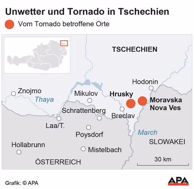 Auf Bildern und Videos in den sozialen Medien war eine gewaltige Windhose zu sehen. Der Wetterdienst CHMU bestätigte später, dass es sich um einen Tornado gehandelt habe. Ein Meteorologe des tschechischen Fernsehens erklärte, es habe sich offenbar um einen Tornado der Stufen F3 bis F4 gehandelt, mit einer Geschwindigkeit von mehr als 330km/h. Davon geht auch ein Experte der Zentralanstalt für Meteorologie und Geodynamik (ZAMG) aus. Die Abklärungen liefen noch. In Tschechien gilt ein Tornado als seltene Erscheinung, den letzten hatte es vor drei Jahren gegeben. In Österreich ereignen sich pro Jahr durchschnittlich vier Tornados.