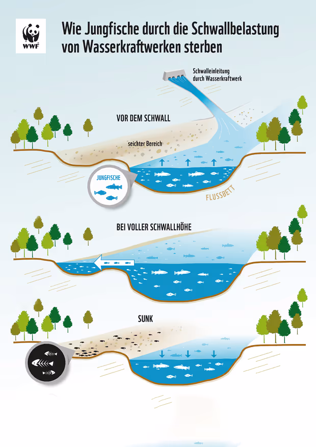 „Wir gehen davon aus, dass in Österreich jedes Jahr bis zu 200 Millionen Jungfische und Fischlarven der Schwall-Sunk-Belastung zum Opfer fallen“, erklärt WWF-Expertin Bettina Urbanek mit Verweis auf wissenschaftliche Untersuchungen an der Drau. Die dort gewonnenen Erkenntnisse wurden auf die insgesamt 875 Kilometer Flussstrecken hochgerechnet, die in Österreich besonders stark durch Schwall und Sunk belastet sein sollen. In Tirol sind das laut WWF Inn und Ziller, im übrigen Österreich die Ill, Bregenzer Ache, Salzach, Drau, Enns und die obere Mur.