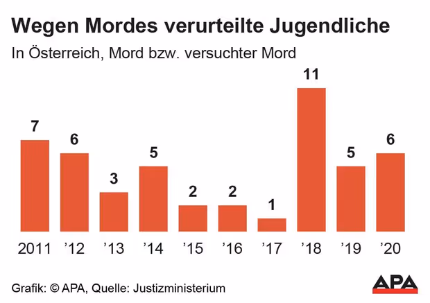 Insgesamt sind seit 2011 in Österreich 99 Burschen oder Mädchen wegen vollendeten oder versuchten Mordes angeklagt worden. Davon wurden 48 Minderjährige anklagekonform verurteilt.