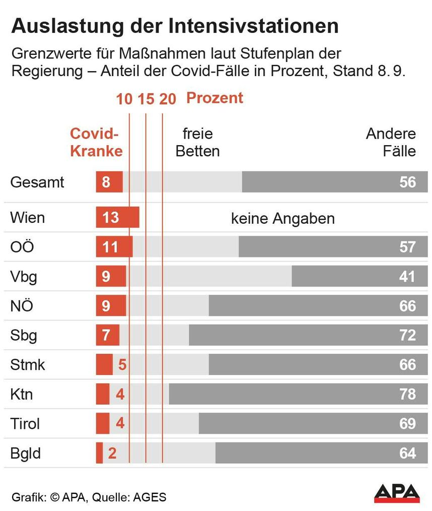 🏥 Verschärfungen bei steigender Auslastung der Intensivstationen: Die Regierung einigte sich mit den Ländern auf eine Art von Paradigmenwechsel. Anders als in der Vergangenheit zielt man in der Zukunft nicht mehr auf eine Sieben-Tage-Inzidenz ab, sondern auf die Situation in den Intensivstationen. (Justament an dem Tag, an dem die Regierung ihr neues Maßnahmenpaket präsentiert, wurden erstmals seit Ende April wieder mehr als 2000 Neuinfektionen binnen 24 Stunden gemeldet. Seit Dienstag kamen österreichweit 2268 weitere Infizierte hinzu. Innerhalb einer Woche mussten in den Spitälern 100 Patienten mehr aufgenommen werden, insgesamt sind bereits 645 Covid-19-Erkrankte hospitalisiert.) Also wurde nun ein Stufenplan präsentiert. Dieser gilt aber vor allem für Nicht-Geimpfte. Der Stufenplan im Detail: