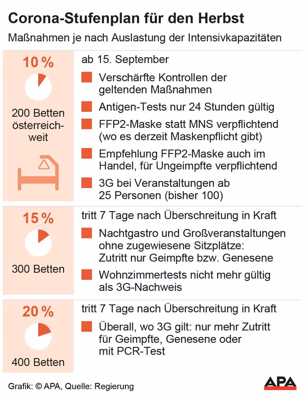 Die Bundesregierung hat in ihrem am Mittwoch vorgestellten Stufenplan angekündigt, ab 15. September (für den eine Auslastung der Intensivbetten mit 10 Prozent erwartet wird) die FFP2-Pflicht wieder einzuführen. Gelten soll diese für alle überall dort, wo schon bisher ein MNS-Schutz zu tragen war (etwa in Geschäften des täglichen Bedarfs wie Supermärkten sowie in Öffentlichen Verkehrsmitteln).