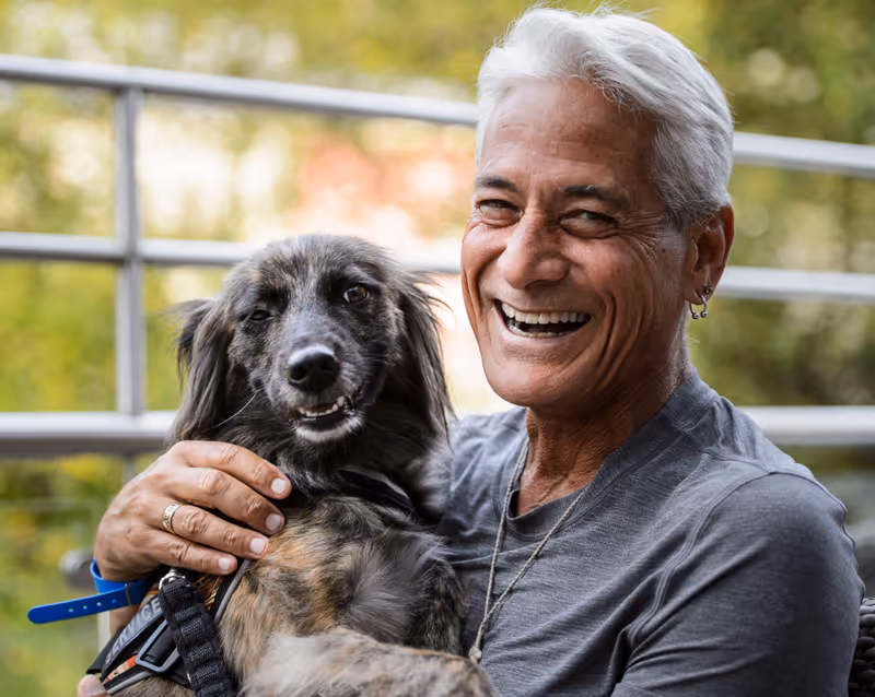Mit einem Lächeln auf den Lippen: Greg Louganis mit seinem Hund „Pax“, der ihn auch in die Area 47 nahe Ötztal-Bahnhof begleitete.