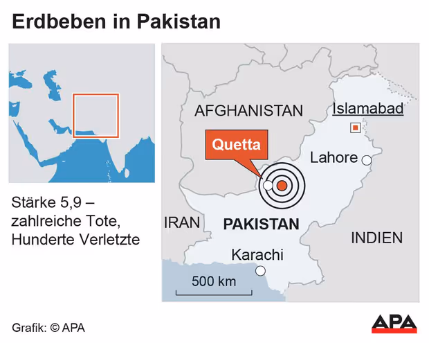 Das Beben hatte die Provinz Baluchistan in den frühen Morgenstunden des Donnerstags erschüttert, wie das örtliche Innenministerium mitteilte. Es erreichte demnach eine Stärke von 5,9 und überraschte viele Menschen im Schlaf. Das Epizentrum des Bebens lag etwa 100 Kilometer östlich der Provinzhauptstadt Quetta, wie das Meteorologische Amt des Landes mitteilte. Die in den USA ansässige Erdbebenwarte USGS bezifferte die Stärke des Bebens auf 5,7.