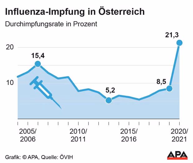 "Wir hatten im Vorjahr ausreichend Impfstoff zur Verfügung in Österreich", berichtete Renée Gallo-Daniel, Präsidentin des Verbandes der Impfstoffhersteller (ÖVIH), bei einer Online-Pressekonferenz. "Leider ist es auch so gewesen, dass wir Impfstoffe wegwerfen mussten, weil wir sie nicht verimpfen konnten." Dennoch war die Impfrate erstmals in den vergangenen Jahren zweistellig, nachdem Impfaktionen gestartet wurden, um durch schwere Influenza-Fälle das Gesundheitssystem und Spitäler in der Covid-Pandemie nicht zusätzlich zu belasten.
