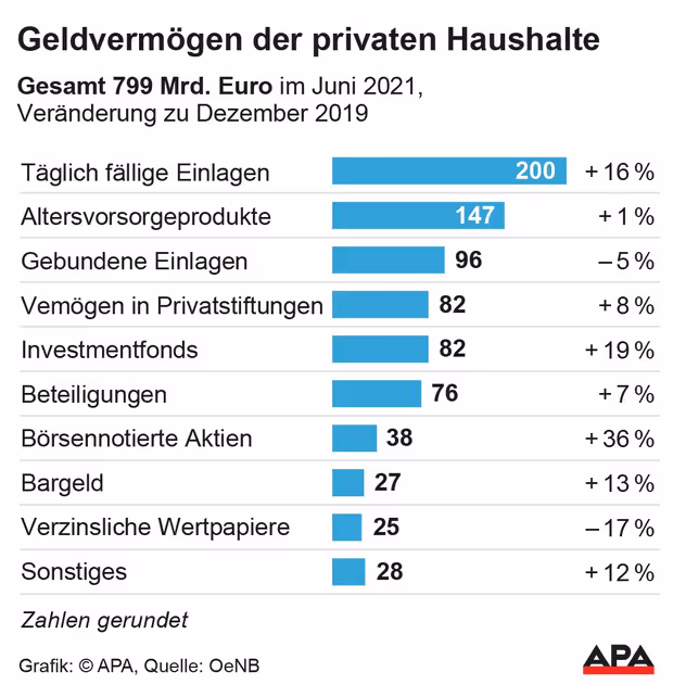 Der private Konsum brach voriges Jahr um 7,2 Prozent ein - ein Minus von rund 15 Mrd. Euro. Die netto verfügbaren Einkommen entwickelten sich negativ (minus 0,7 Prozent). Die Sparquote kletterte auf den Höchstwert 14,4 Prozent. Von den verfügbaren Mitteln flossen 28,5 Mrd. Euro (2019: 16,8 Mrd. Euro, plus 70 Prozent) in finanzielle Veranlagungen. Somit gab es 2020 ein Geldvermögen von knapp 780 Mrd. Euro. Im Juni 2021 wurde gar ein historischer Höchststand von 799 Mrd. Euro erreicht - ein Plus von 8 Prozent gegenüber dem Pandemiebeginn Ende 2019. Fürs laufende Jahr erwartet die Nationalbank einen Rückgang der Sparquote auf etwa 10 oder 11 Prozent und sieht darin eine "gute Nachricht".