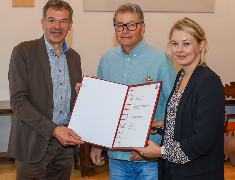 „Es gibt auch in schwierigen Zeiten schöne Augenblicke“, so leitete BM Georg Willi bei seiner einfühlsamen Rede für einen besonderen Ehrengast im Alten Rathaus treffend ein. Didi Constantini wurde am Montag ausgezeichnet. Zusammen mit dem Bürgermeister überreichte auch Sportstadträtin Elisabeth Mayr das Sportehrenzeichen und das Verdienstkreuz der Stadt.