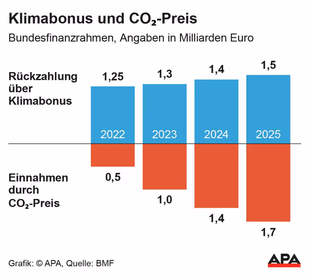 Die Einnahmen aus der CO2-Steuer sollen kumuliert bis 2025 rund fünf Mrd. Euro betragen, wobei sie 2022 nur rund eine halbe Mrd. ausmachen werden. Der CO2-Preis fließt – je nach Öffi-Erschließung – als regionaler Klimabonus an die Bevölkerung zurück. Dafür gibt es vier Stufen: In Wien sind es 100 Euro, in allen anderen Gemeinden bekommt man 133, 167 oder 200 Euro pro Jahr und Person. Für Kinder gibt es die Hälfte.