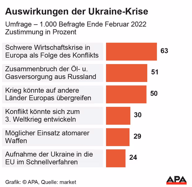 Eine klare Mehrheit geht jedenfalls von wirtschaftlichen Schwierigkeit aufgrund des Konfliktes aus. 63 Prozent erwarten laut market-Institut durch den Krieg eine schwere Wirtschaftskrise in Europa, 51 Prozent rechnen mit einem Zusammenbruch der Öl- und Gasversorgung aus Russland. Unter den Gallup-Teilnehmern rechnen zudem 83 Prozent mit steigenden Energiekosten, 79 Prozent mit einer Teuerung der Lebensmittel. Drei Viertel sorgen sich vor möglichen Energieengpässen.