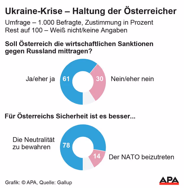 Trotz der möglichen wirtschaftlichen Folgen unterstützt eine klare Mehrheit die westlichen Sanktionen gegen Russland: Drei Viertel der vom TQS Institut befragten, sind dieser Meinung. In der Gallup-Umfrage sind es 71 Prozent. Allerdings stimmen hier nur 61 Prozent der Aussage zu, dass auch Österreich sich an diesen Sanktionen beteiligen soll. Große Unterschiede gibt es je nach parteipolitischer Zugehörigkeit. Anhänger der Grünen befürworten eine österreichische Teilnahme an den Sanktionen mit 91 Prozent am deutlichsten. Einzig unter den Anhängern von FPÖ und MFG ist eine Mehrheit (63 Prozent) gegen eine Beteiligung.