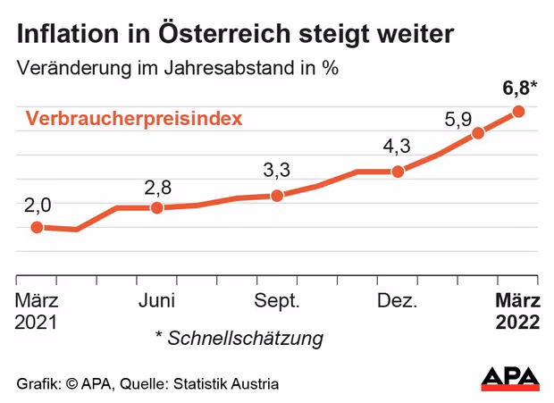 Getrieben von den Energiepreisen ist die Teuerung laut Schnellschätzung der Statistik Austria in Österreich im März auf 6,8 Prozent gestiegen.