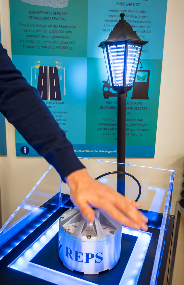 Sie entwickelten in drei Jahren Forschung in der Werkstätte Wattens einen Energiewandler, integrierten ihn in Bodenplatten und reichten den Mechanismus mit dem Namen REPS (Road Energy Production System) beim europäischen Patentamt ein, womit er jetzt geschützt ist. Mithilfe dieses Mechanismus könne die senkrecht wirkende Kraft eines Schrittes oder eines Fahrzeugs mithilfe elektromagnetischer Induktion zu Strom umgewandelt werden, erklärt der 26-jährige Huber. Dass das funktioniert, hätten sie in über 15.000 Messungen und mehreren tausend Simulationen nachgewiesen. Ebenso, dass dies nicht Herzschrittmacher oder orthopädische Schrauben beeinflusse.