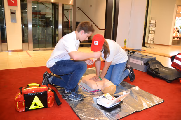 Wörgl – Eine Person bricht im Einkaufszentrum M4 in Wörgl zusammen. Zwei junge Helfer sind zur Stelle, sprechen den Patienten an. Als keine Antwort kommt, beginnt das Mädchen mit einer Herzmassage, während der Bursch die Rettung verständigt, einen Defibrillator sucht und für den Einsatz bereit macht. Da muss jeder Handgriff sitzen, damit die Person eine Überlebenschance hat.