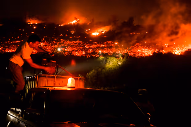 Der Brand war am Dienstagnachmittag aus unbekannten Gründen ausgebrochen. Wegen der starken Winde breiteten sich die Flammen rasch aus und drangen in bewohntes Gebiet ein. Zahlreiche Häuser wurden beschädigt. Drei Feuerwehrleute und neun Einwohner sind Berichten des staatlichen Rundfunks zufolge verletzt und mit Atemwegsbeschwerden in Krankenhäuser gebracht worden. Einer der verletzten Einwohner wurde wegen schwerer Verbrennungen behandelt, wie der Rettungsdienst mitteilte. Sieben Ortschaften und ein Kinderkrankenhaus wurden evakuiert.