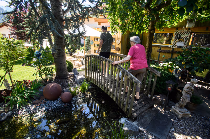 Liebliche Landschaftsarchitektur: Im Garten der Familie Jenewein in Prutz gehört eine kleine Holzbrücke zum Kern der Anlage.
