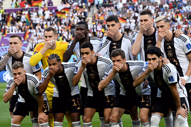 Hand vor den Mund: DFB-Auswahl mit Zeichen gegen FIFA