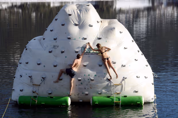 Nach einer Schockkühlung mit einem Kübel Eiswasser gilt es, aus drei Metern Höhe in den See zu springen, 25 Meter zu einem Eisberg zu schwimmen, diesen hochzuklettern, die Silvesterglocke zu läuten und ans Ufer zurückzuschwimmen.