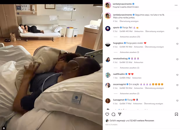 Die Pelés Tochter hatte zuvor ein Foto des dreimaligen Weltmeisters veröffentlicht, dessen Gesundheitszustand sich in den vergangenen Tagen erneut verschlechtert hat. Auf dem Bild ist der 82-Jährige im Krankenbett zu sehen, dabei hält er seine Tochter Kely Nascimento im Arm. „Wir machen hier weiter, im Kampf und im Glauben. Noch eine Nacht zusammen”, schrieb sie in der Nacht zum Samstag in ihrem Instagram-Posting dazu.