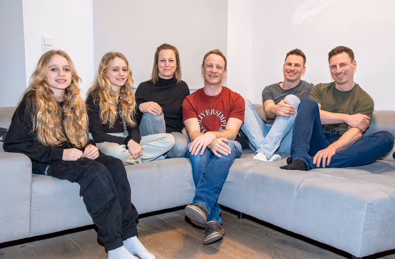 Eine Familie, drei Zwillinge: Links Paula und Nora, Papa Michael und Zwillingsschwester Bernadette in der Mitte, rechts Johannes und Lorenz, die Onkel mütterlichseits der beiden Mädchen.