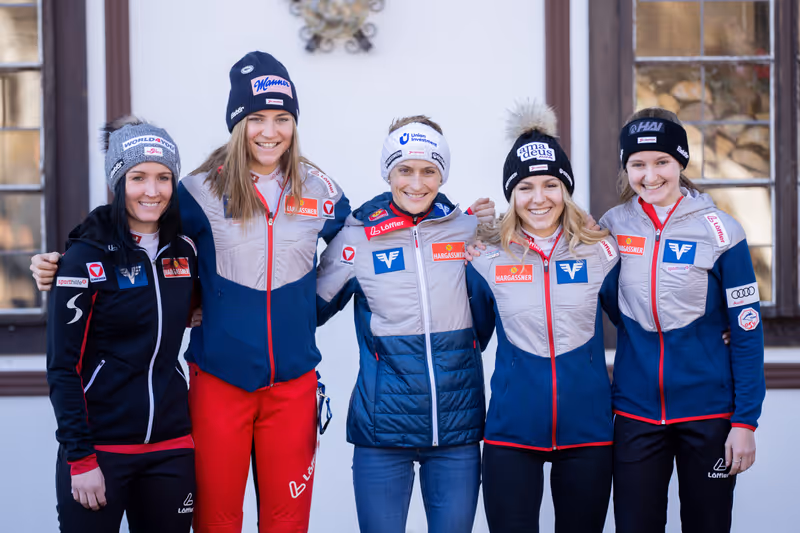 Die ÖSV-Skispringerinnen gehen bestens gelaunt in die WM in Planica, Sara Marita Kramer (2. v. l.) ist wieder im Team dabei.