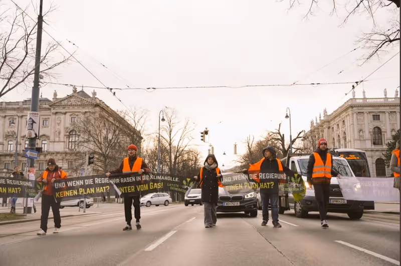 Gegen 8.00 Uhr startete die Aktion auf der Höhe des Natur- und Kunsthistorischen Museums, um die Ringstraße kurzfristig zum Wanderweg umzufunktionieren. In Fahrtrichtung zogen die Aktivistinnen und Aktivisten entlang, "um in der Klimakrise wenigstens die einfachsten, billigsten Schutzmaßnahmen von (Bundeskanzler Karl, Anm.) Nehammer und (Vizekanzler Werner, Anm.) Kogler einzufordern: einen Stopp neuer Öl- und Gasbohrungen, und Tempo 100 auf der Autobahn".