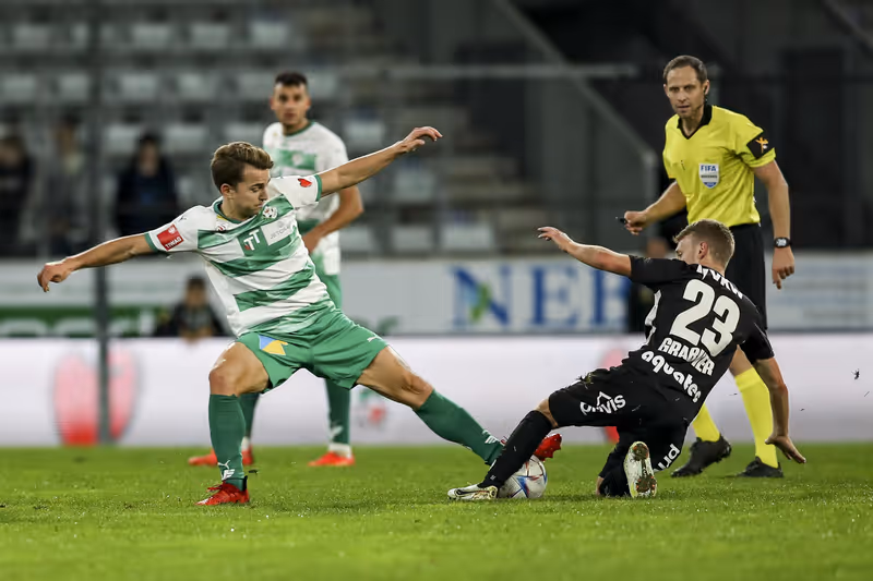 Neben der WSG Tirol um Valentino Müller (l.) könnte auch Lustenau (r. Grabherr) in der kommenden Saison öfters im Tivoli grätschen.