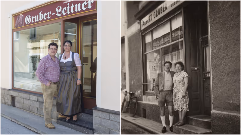 Christian Leitner und seine Frau Johanna vor dem Geschäft in Kufstein. Sie haben das alte Foto von Leitners Großeltern, Albert und Maria Gruber, nachgestellt.