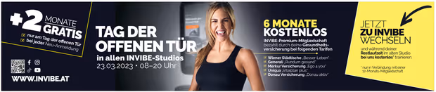 INVIBE schenkt dir zu allen Tarifen (ausgenommen Super Flex) 2 Monate Premium Fitness kostenlos – persönliche Betreuung durch das professionelle INVIBE Trainer- und Physioteam inklusive! INVIBE bietet maßgeschneiderte Betreuungspakete, welche individuell an deine Trainingsziele angepasst werden. Für Group-Fitness-Fans bietet INVIBE mehr als 180 Fitnesskurse pro Woche wie Yoga, Pilates, Bauch-Beine-Po, Spinning, zahlreiche HIT Workouts, Kickboxen, Gesunder Rücken uvm.