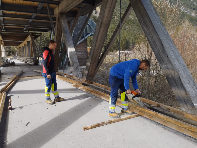 Elmen – Mit Brecheisen und Motorsäge sind seit gestern Arbeiter an der Klimmbrücke in Elmen am Werk.