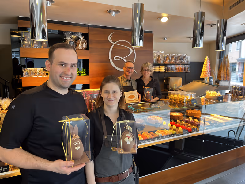 Die möglichen Betriebsnachfolger Mathias mit seiner Lisa und den Seniorchefs Erwin und Birgit im Konditorei-Café Regensburger freuen sich darüber, in der Kramergasse bleiben zu können.