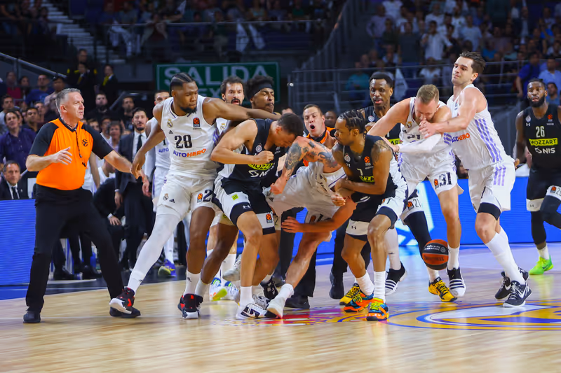 Madrid - Das Euroleague-Spiel der Basketball-Teams von Real Madrid und Partizan Belgrad ist kurz vor Ende wegen einer Massenschlägerei der Spieler abgebrochen worden. Nach einem harten Foul von Reals Aufbauspieler Sergio Llull 100 Sekunden vor Schluss gerieten Profis beider Teams auf dem Parkett aneinander und mussten zurückgehalten werden.