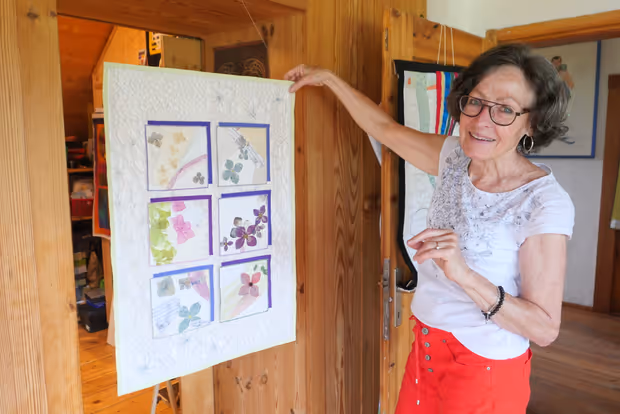 Auf dem Weg zum Atelier, das sich die Künstlerin unter dem Dach ihres Hauses eingerichtet hat, kommt man an zahlreichen Quilts vorbei. Der Hausgang und die Wendeltreppe in den ersten Stock gleichen einer Galerie. Jedes Kunstwerk hat seine Geschichte, und die Künstlerin erzählt gerne davon. Ehemann Renato nutzt die freien Stellen, um seine Skulpturen aus Holz zu präsentieren. Er hat seine Werkhalle im Keller des Hauses. „Ja, wir haben es fein hier“, sagt die Künstlerin. Die Arbeit im Haus und im Garten geht jedenfalls nicht aus. Und auch die Enkelkinder freuen sich über jede Minute bei Oma und Opa.