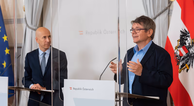 Arbeitsminister Martin Kocher (ÖVP) und ÖGB-Präsident Wolfgang Katzian präsentierten zu Beginn des Corona-Lockdowns eine Kurzarbeitsregelung.