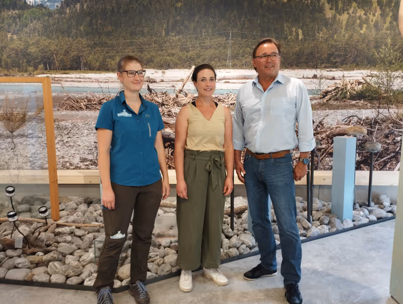 Die Naturparkgeschäftsführerinnen Lena Nicklas und Nora Schneider (v. l.) sowie Obmann Heiner Ginther freuen sich auf die Eröffnung der Ausstellung, welche über die Besonderheiten des Wildflusses informiert.