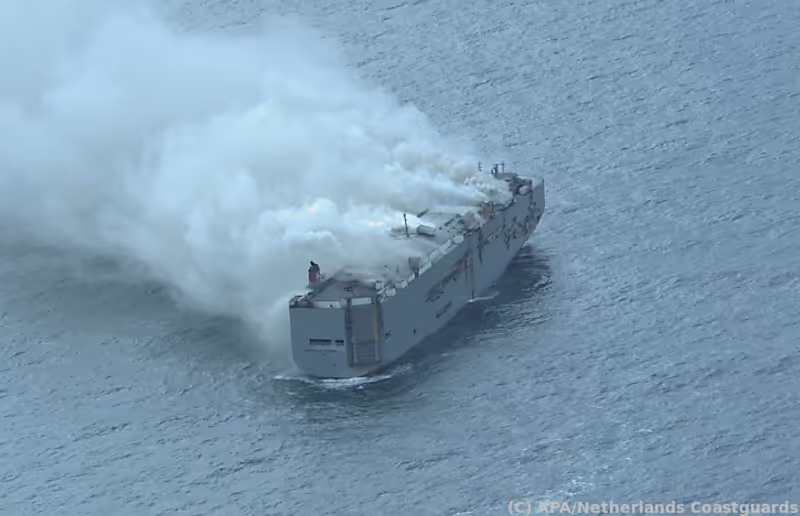 Der unter der Flagge von Panama fahrende Frachter war auf dem Weg von Bremerhaven nach Singapur, als in der Nacht zum Mittwoch das Feuer ausbrach. Die Brandursache ist noch unklar. Möglicherweise war der Brandherd in der Batterie eines elektrischen Autos. Das Schiff hat 25 E-Autos geladen.