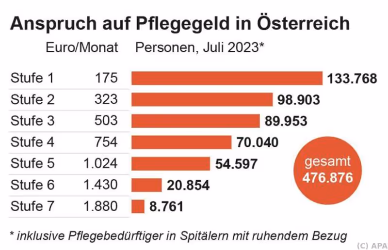 Die Zahl der Pflegegeldbezieher ist im zweiten Halbjahr 2023 im Jahresvergleich leicht gestiegen. Zuletzt (Stand Juli 2023) erhielten 476.876 Personen die Geldleistung, wie aus den aktuellsten Daten des Sozialministeriums hervorgeht. Das bedeutet ein leichtes Plus von 8.054 Personen bzw. 1,72 Prozent gegenüber Juli 2022 (468.822 Bezieher). Im Vergleich zum Vormonat Mai gab es um 1.280 Anspruchsberechtigte mehr (+0,27 Prozent).