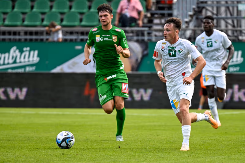 Julius Ertlthaler (r.) möchte morgen im Gastspiel bei Ex-Club Hartberg seinen Teil dazu beitragen, dass die WSG Tirol wieder Punkte einfährt.