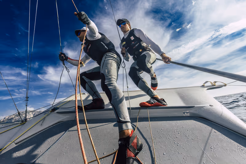 Innsbruck, Vilamoura – Der Blick reicht längst bis Paris 2024. Genauer gesagt nach Marseille, wo in achteinhalb Monaten die olympischen Segelbewerbe beginnen. Und doch ist die heute beginnende Segel-Europameisterschaft vor Vilamoura (POR) mehr als nur eine Standortbestimmung für Tirols 49er-Vorschoter David Hussl, der gemeinsam mit Steuermann Benjamin Bildstein die Rückkehr in die absolute Weltklasse anstrebt. Dafür spielen die beiden die Risiko-Karte aus und entschieden sich bereits nach ein paar Trainingstagen an der Algarve für einen neuen Mast. „Wir haben gemerkt, dass wir mit dem bisherigen Material gegen die absolute Weltspitze nicht ankommen“, berichtet Bildstein und spricht von einem mutigen Entschluss. Mutig, aber alternativlos, zumindest wenn man in vorolympischen Sphären denkt.