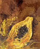 In der Galerie Rhomberg (Templstraße 2–4, Innsbruck) ist noch bis 12. Jänner 2024 die Ausstellung „Paul Renner – Goyanische Canederli, Press- und Ingredienzien Bilder“ zu sehen (im Bild „Papaya“, 2022, Öl, Dammar und Kerne und auf Holz, 70 × 56 cm).