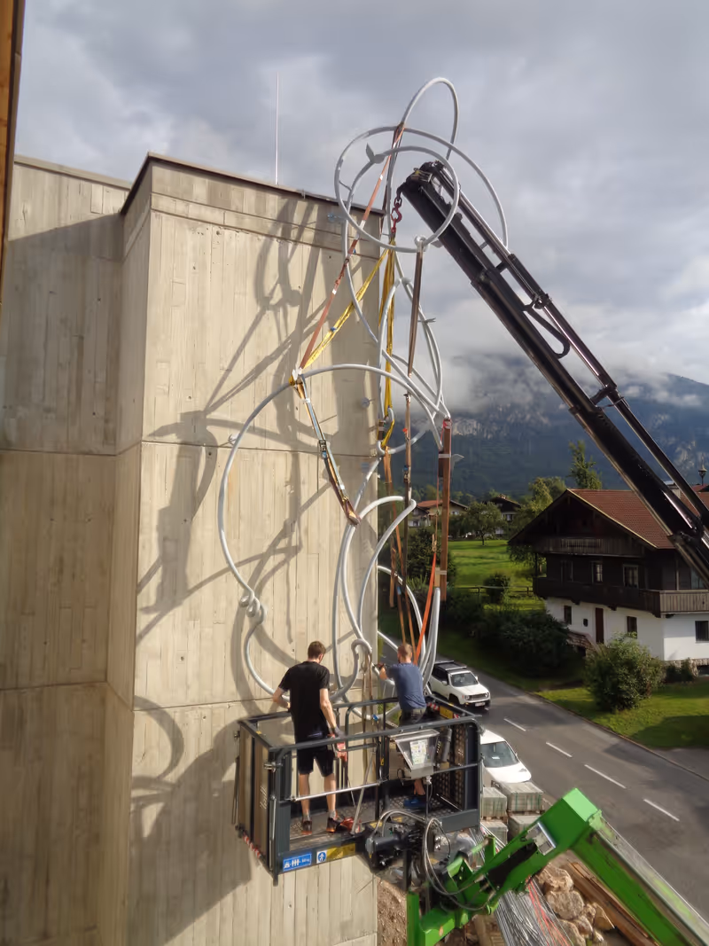 Mit dem Werk „Flugbahn der Kristalle“ will Schild an diese „außergewöhnliche Person“ erinnern. Die zwölf Meter hohe Skulptur besteht aus gebogenen Stahlrohren in einer Endlos-Umlaufbahn, „die Flugerfahrungen Schulers mit seiner Leidenschaft für Mineralien kombinierte“, erklärt der Künstler. Das Bodenständige verschmilzt mit dem Luftigen. An die Hausgemeinschaft richtet er die Worte: „Was sind unsere Flugbahnen und Schätze, immateriell und materiell? Für die BewohnerInnen ist sie dynamisches Lebenszeichen zu vielfältiger Verbundenheit.“ (TT)
