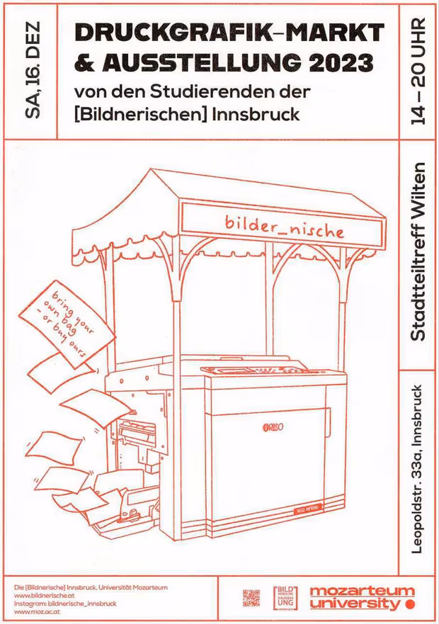 Die Studierenden der Bildnerischen Erziehung Innsbruck und die Universität Mozarteum, laden zum vorweihnachtlichen Druckgrafikmarkt mit Pop-Up Ausstellung in den Stadtteiltreff Wilten in der Leopoldstrasse ein. Postkarten, Poster, Taschen, Shirts, Sticker, Publikationen und allerhand weiterer künstlerisch-kollaborative Druckwerke in verschiedensten Variationen – von Sieb- über Linoldruck hin zu Risografie und experimentellen Mischtechniken – können von BesucherInnen entdeckt und erworben werden. Beginn ist um 14 Uhr. Mehr dazu HIER.