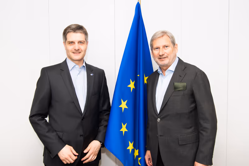 Martin Schaffenrath (links) vom Europäischen Wirtschafts- und Sozialausschuss mit EU-Kommissar Johannes Hahn in Brüssel.