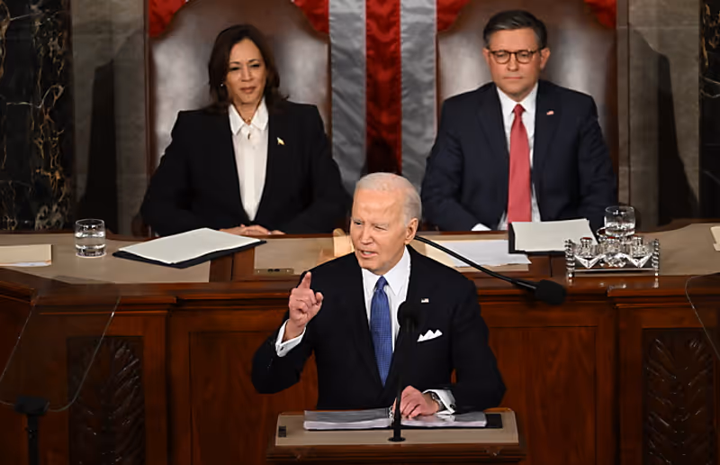 Mit Blick auf den Ukraine-Krieg forderte Biden den Kongress erneut auf, weitere US-Hilfen für das von Russland angegriffene Land freizugeben. "Meine Botschaft an Präsident Putin, den ich seit langem kenne, ist einfach: Wir werden nicht weglaufen", sagte Biden an den Kremlchef gerichtet. "Wenn irgendjemand in diesem Raum meint, Putin würde nach der Ukraine haltmachen, dann ist das falsch. Ich versichere Ihnen, das wird er nicht."