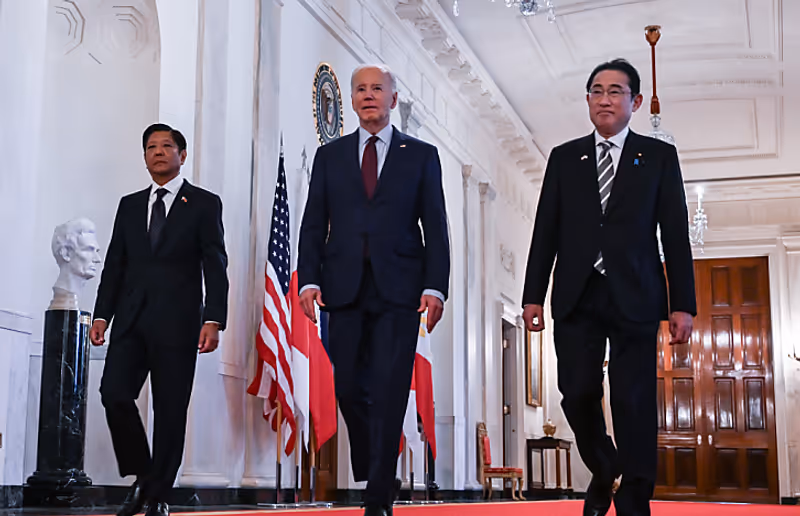 US-Präsident Joe Biden hat Japan und den Philippinen bei einem Dreiergipfel in Washington die Unterstützung der Vereinigten Staaten im Verteidigungsbereich zugesagt. Die Verpflichtungen der USA gegenüber den beiden asiatischen Ländern seien unerschütterlich, sagte Biden am Donnerstag bei dem Treffen mit seinem philippinischen Kollegen Ferdinand Marcos und dem japanischen Ministerpräsidenten Fumio Kishida.