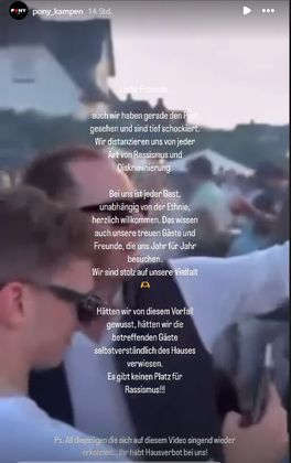„Hätten wir von dem Vorfall gewusst, hätten wir die betreffenden Gäste selbstverständlich des Hauses verwiesen. Es gibt keinen Platz für Rassismus!!!“, schrieben die Betreiber des Lokals auf Instagram weiter. Jeder Gast unabhängig von der Ethnie sei herzlich willkommen. Die Betreffenden bekämen Hausverbot, hieß es. In einem weiteren Beitrag schrieben die Betreiber, sie hätten nun die Namen „dieser Nazis zugespielt“ bekommen. „Wir werden dieses widerliche Verhalten anzeigen und alle strafrechtlichen Möglichkeiten nutzen!!!“