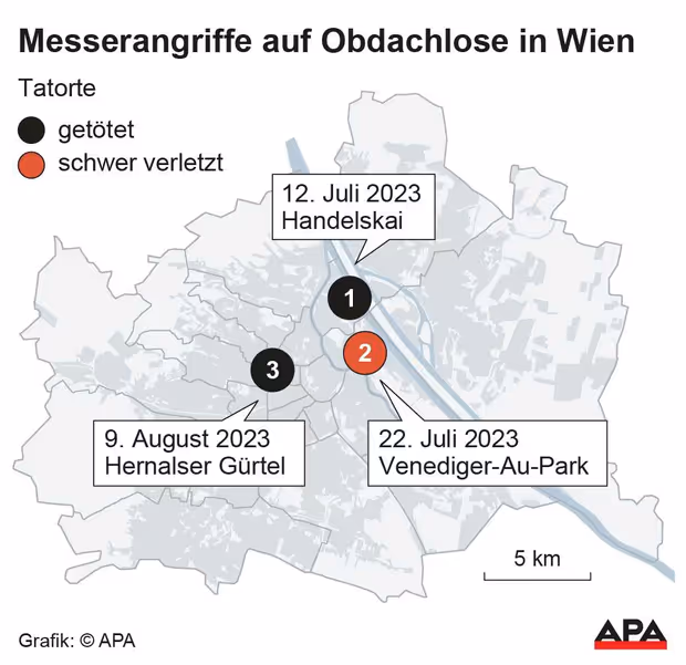 Der zu den Tatzeitpunkten 17-Jährige stach zunächst am 12. Juli 2023 mit einem Kampfmesser auf einen 56-jährigen Mann ein, der sich am Handelskai in Wien-Brigittenau niedergelassen hatte. Das schlafende Opfer wachte nach den ersten Stichen in den Bauch auf, schrie und versuchte sich aufzurichten. „Er hat weiter zugestochen. Auch in den Kopf“, erklärte die Staatsanwältin. Der Angeklagte habe den Tatort verlassen, „wissend, dass er nicht überleben wird“, sich ein Getränk gekauft und in einem nahe gelegenen Park Youtube-Videos geschaut. Dann sei er heimgegangen.