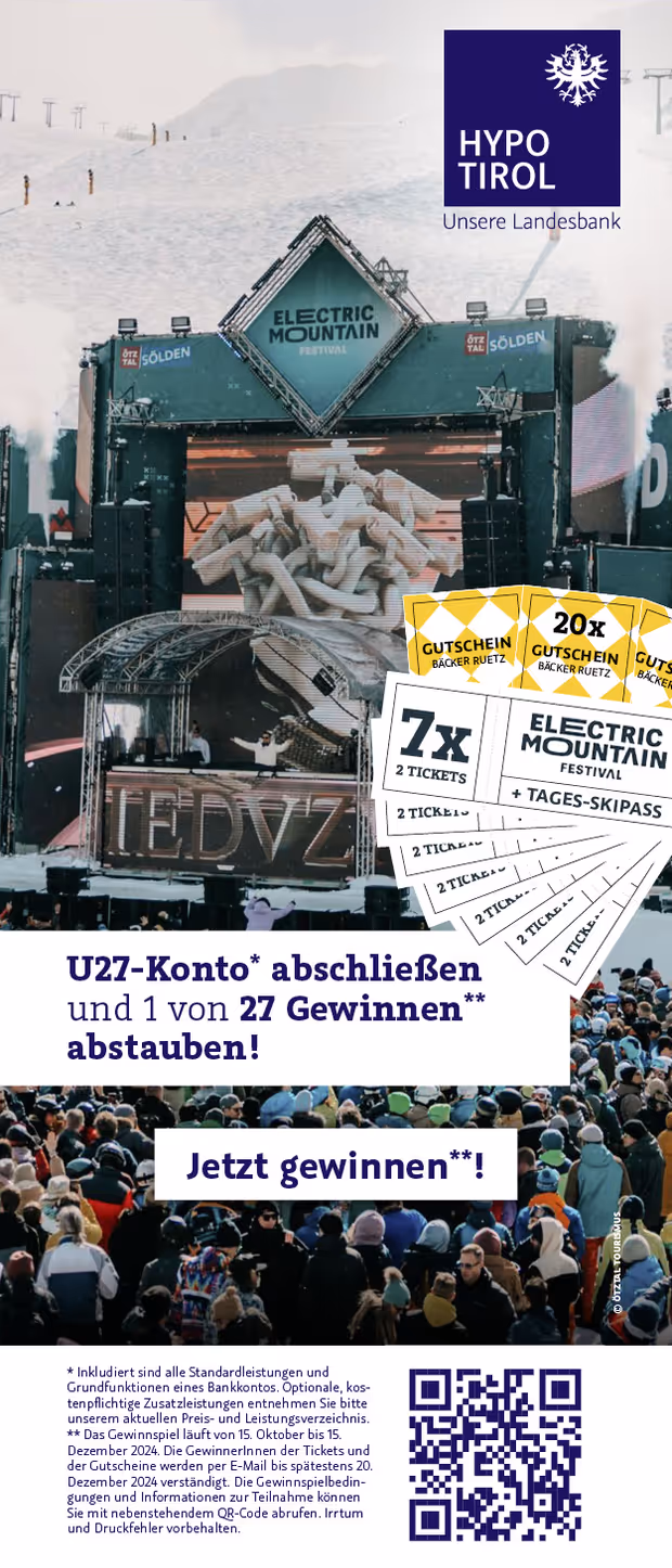 Sie finden, das ist eine gute Idee? Wunderbar! Geben Sie uns Ihr Startsignal. Eröffnen Sie ein U27 Gratis-Konto* persönlich in einer unserer Geschäftsstellen. Oder online rund um die Uhr, unabhängig von den Öffnungszeiten, unter https://www.hypotirol.com.