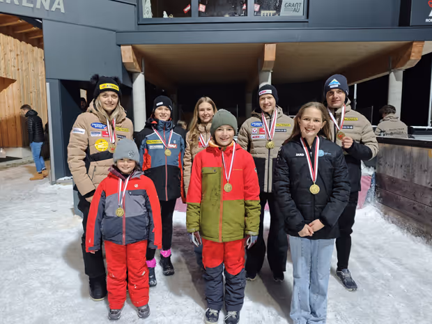 Alle Tiroler Meister im Naturbahnrodeln im Überblick: Riccarda Ruetz, Eva Achenrainer, Michael Salner, Naomi Thöni, Linus Kammerlander, Leon Auer, Anna Fuchs und Fabian Achenrainer (von links).